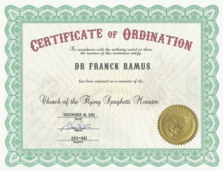 Je suis très fier de vous annoncer qu’au terme d’une longue initiation j’ai été ordonné prêtre de l’Eglise du Monstre en Spaghetti Volant. Vous trouverez ci-dessous copie de mon certificat d’ordination, signé de la main du prophète en personne.