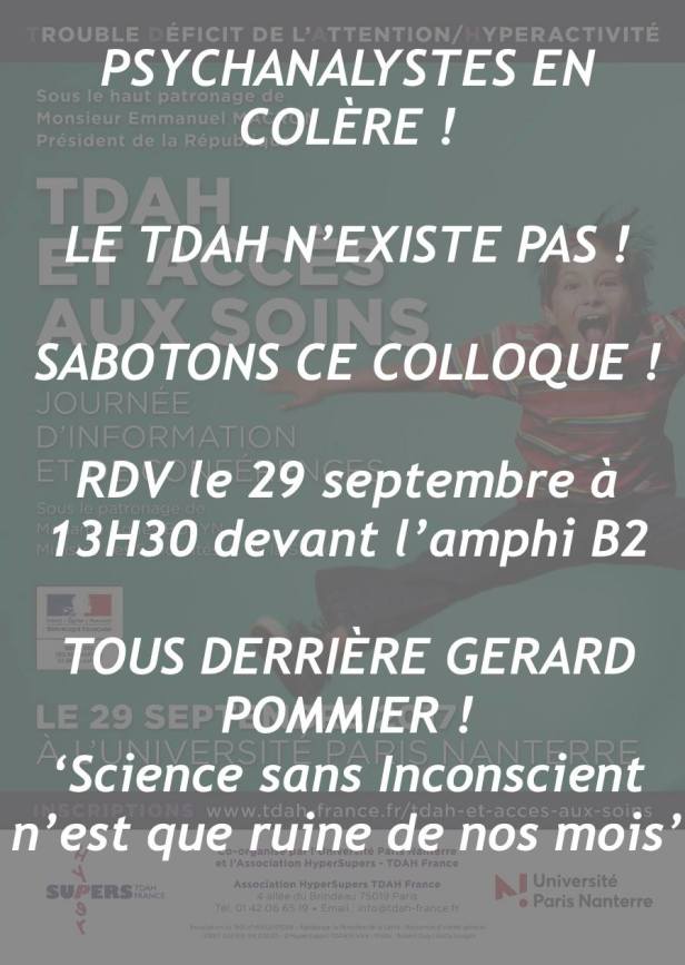 Gérard Pommier et ses acolytes cherchent maintenant à empêcher ou à perturber le prochain colloque sur le TDAH qui se tiendra le 29/09/2017 à l’université Paris Nanterre, et qui aurait le mauvais goût de se baser sur les classifications diagnostiques les plus récentes établies au niveau international. De toute évidence, la vérité alternative ne supporte pas la contradiction.