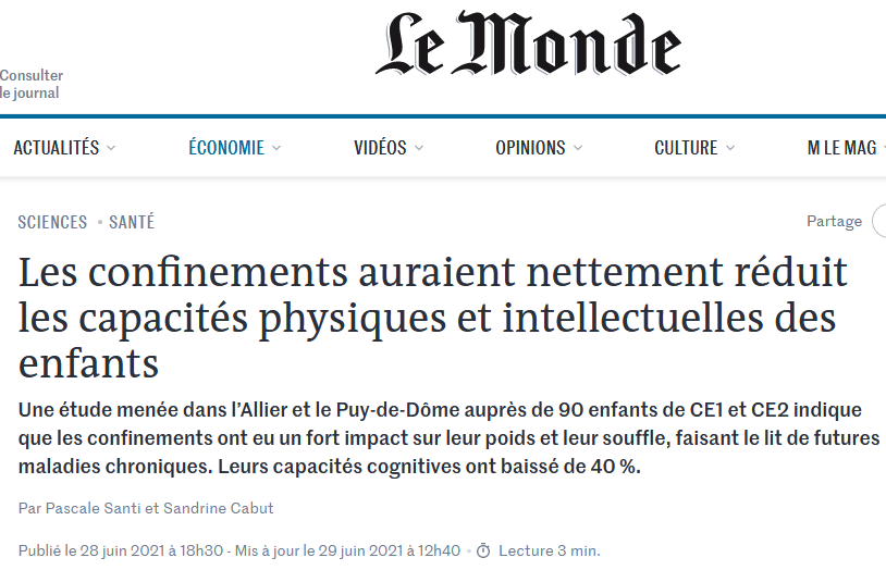 Dans un précédent article, je réagissais à un article du Monde qui annonçait 40% de baisse des capacités cognitives des enfants suite au confinement. Ce résultat ne semblait absolument pas plausible, et je reprochais à l’article de s’être basé sur une étude scientifique non publiée. J’évoquais les éventualités suivantes :