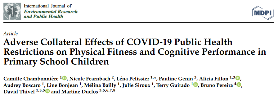 Chambonnière, C., Fearnbach, N., Pelissier, L., Genin, P., Fillon, A., Boscaro, A., Bonjean, L., Bailly, M., Siroux, J., Guirado, T., Pereira, B., Thivel, D., & Duclos, M. (2021). Adverse Collateral Effects of COVID-19 Public Health Restrictions on Physical Fitness and Cognitive Performance in Primary School Children. International Journal of Environmental Research and Public Health, 18(21), Art. 21. https://doi.org/10.3390/ijerph182111099