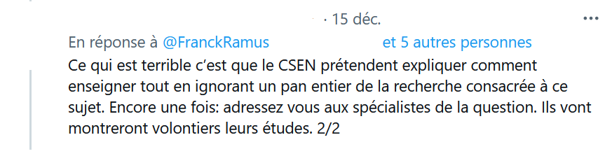 Bien sûr, l’ignorance des membres du CSEN ne se limite peut-être pas aux 19 points évoqués dans le document. Il y a peut-être d’autres résultats importants de la recherche en éducation qui vous semblent injustement négligés, et que vous souhaitez porter à notre connaissance. C’est l’occasion ou jamais.