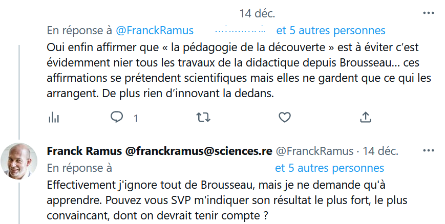 Bonjour. Pour compléter mon propos que vous citez sur les recherches en didactique et sur la théorie des situations didactiques de Brousseau dont vous ignoriez l’existence, j’ai commencé à chercher des articles contenant des expérimentations qui se situent dans ce cadre théorique. Pour le rappeler très sommairement, le principe est de faire découvrir aux élèves certaines notions par des situations problèmes bien choisies et bien conduites. C’est une pratique courante de nos jours dans l’enseignement des maths en France et qui donc s’oppose à votre proposition « Eviter la pédagogie de la découverte ». Cette démarche s’inscrit dans les théories socio-constructivistes type Piaget etc. Depuis Brousseau on trouve des milliers d’articles de didactique sur Publimaths ou autre des IREM, mais il est vrai que tous ne présentent pas toujours des expérimentations avec élèves, et ce n’est pas simple de s’y retrouver vu la masse d’articles à lire.
